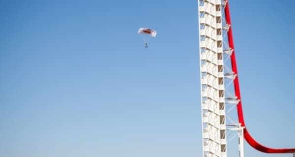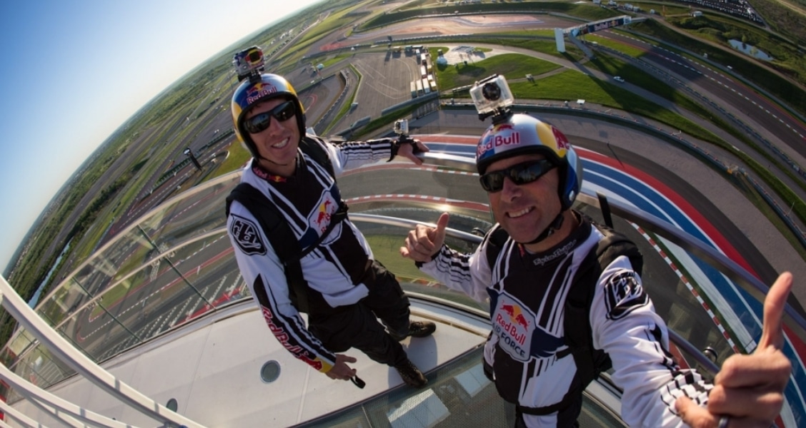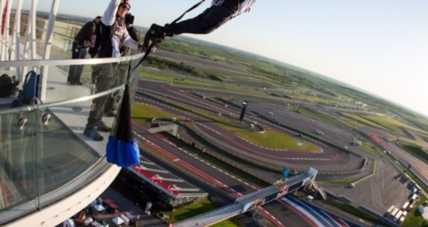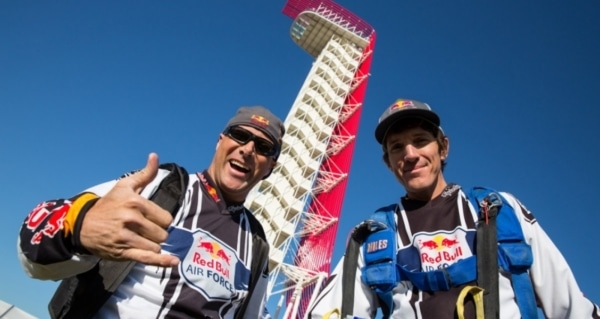 Circuit of The Americas™ kicked off the Red Bull MotoGP of The Americas in style on the morning of Friday, April 19, as two members of the Red Bull Air Force—a team assembled from the most accomplished and experienced skydivers, B.A.S.E. jumpers and paragliders on the planet—performed the first ever B.A.S.E. jumps off the iconic Circuit of The Americas 25-story observation Tower. The jumpers, Miles Daisher and Jeff Provenzano, leapt off the 251-foot structure with a static line and opened their chutes about 60 feet into their descent.
