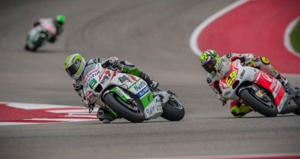 With Marquez and Pedrosa running away from the field, the day’s race essentially wound up being a battle for third through 12th place. In the early laps Andrea Iannone, on the No. 9 Pramac Racing Ducati, overtook those in front of him and replaced Bradl in the third spot. However, he instead wound up seventh, with Bradl finishing fourth.