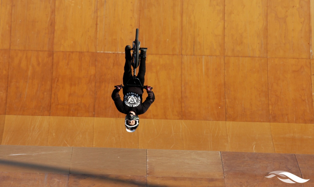 SKATEBOARD, BMX ATHLETES PRACTICE ON BIG AIR RAMP FOR X GAMES AUSTIN