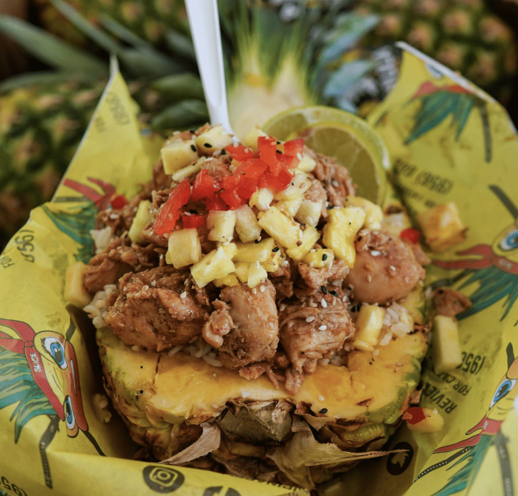 - Pineapple Ninjaz– (Gluten-Free) Grilled Chicken Bowl – Grilled orange marinated chicken served with jasmine rice, pineapple, red bell peppers and sesame seeds.